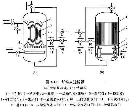 纖維束過(guò)濾器有碳鋼和不銹鋼材質(zhì),過(guò)濾器設(shè)備由固定多孔板、活動(dòng)多孔板、纖維束濾料、布?xì)庋b置等組成。活動(dòng)多孔板可上下移動(dòng),過(guò)濾時(shí),在水力作用下,濾料順?biāo)鞣较蚩障队纱笾饾u變小,纖維密度變大,形成理想的過(guò)濾層面,其過(guò)濾過(guò)程既有縱向深層過(guò)濾,又有橫向深層過(guò)濾,有效地提高了過(guò)濾精度和過(guò)濾速度;清洗時(shí),使纖維束達(dá)到疏松狀態(tài),同時(shí),采用氣水合洗的方法,在氣泡聚散和水力沖洗過(guò)程中,纖維束處于不斷抖動(dòng)狀態(tài),在水力和上升氣泡的作用下,反沖洗濾料而使其再生。